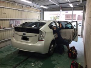 そして工場ではカーフィルムの施工中。こちらのプリウスも売約済みの商品です。